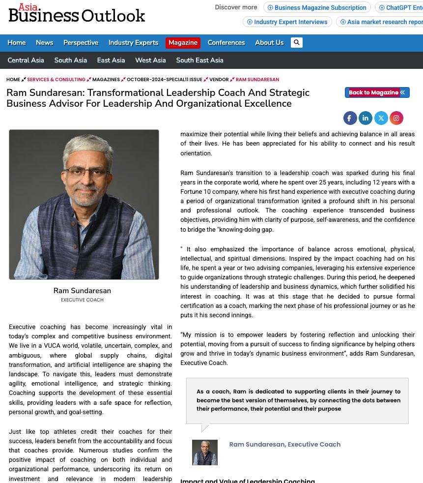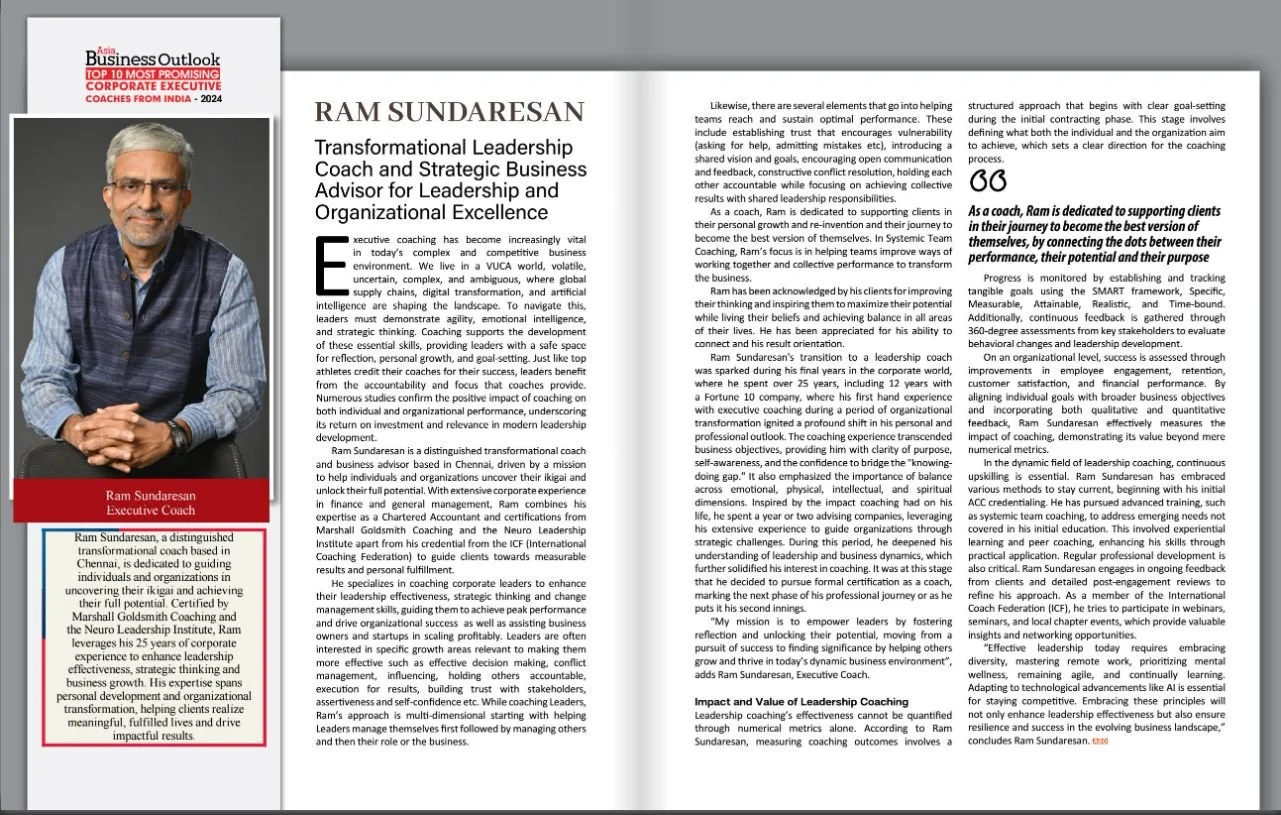 Coach, advisor and former corporate leader with 25+ years across finance and general management. Ram helps leaders bridge the gap between knowing and doing — aligning purpose with performance to create sustainable results.
